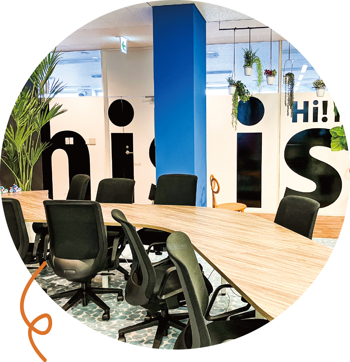曲線のテーブルを挟んでコミュニケーションを取ることができます。後ろの壁画「This is Me」は社員に向けたメッセージです。